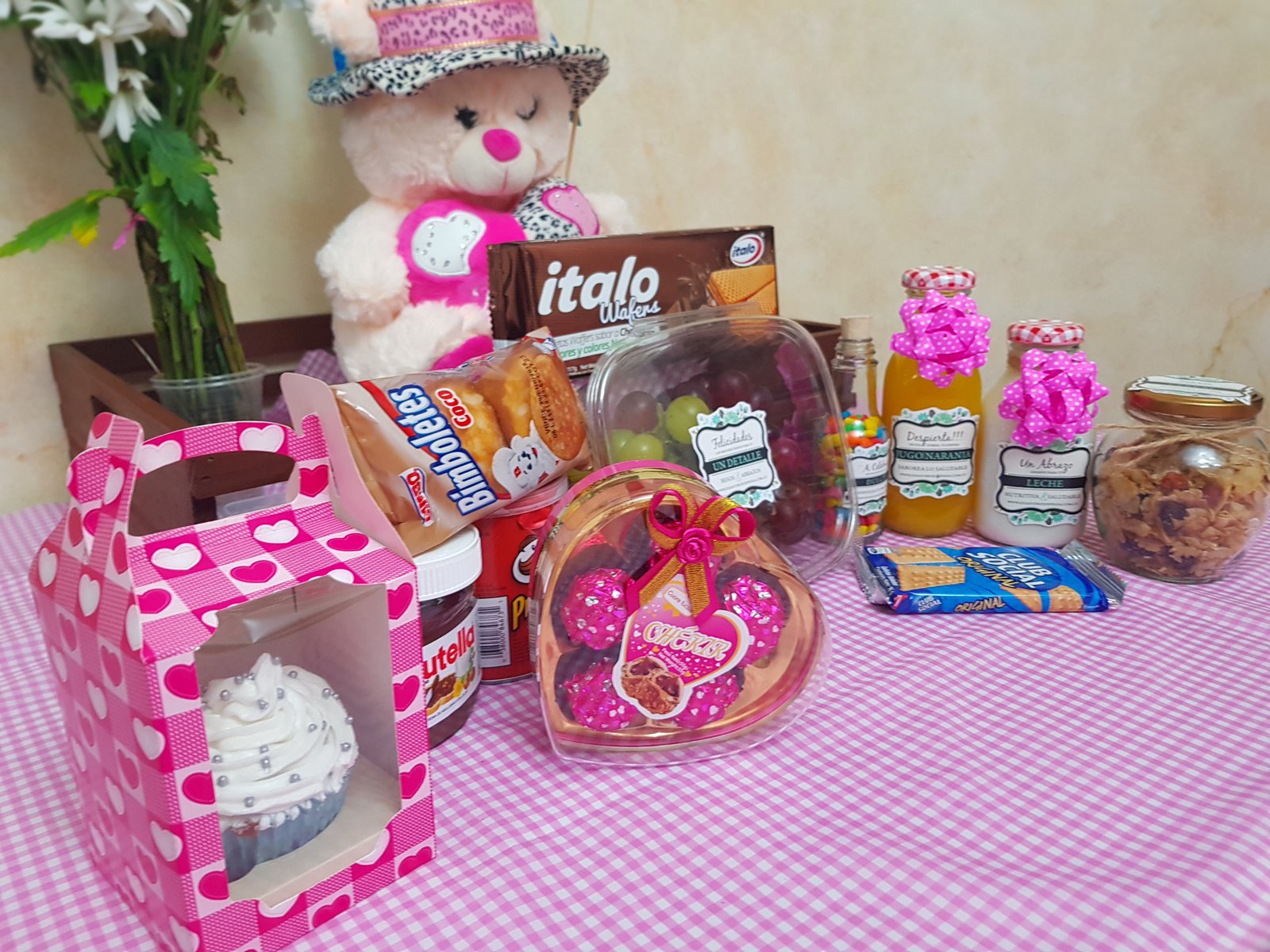 Este desayuno es empacado en un hermoso guacal de madera pintada, forrado con papel celofán y con un moño grande.