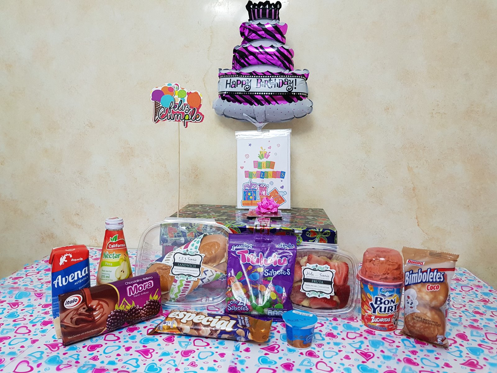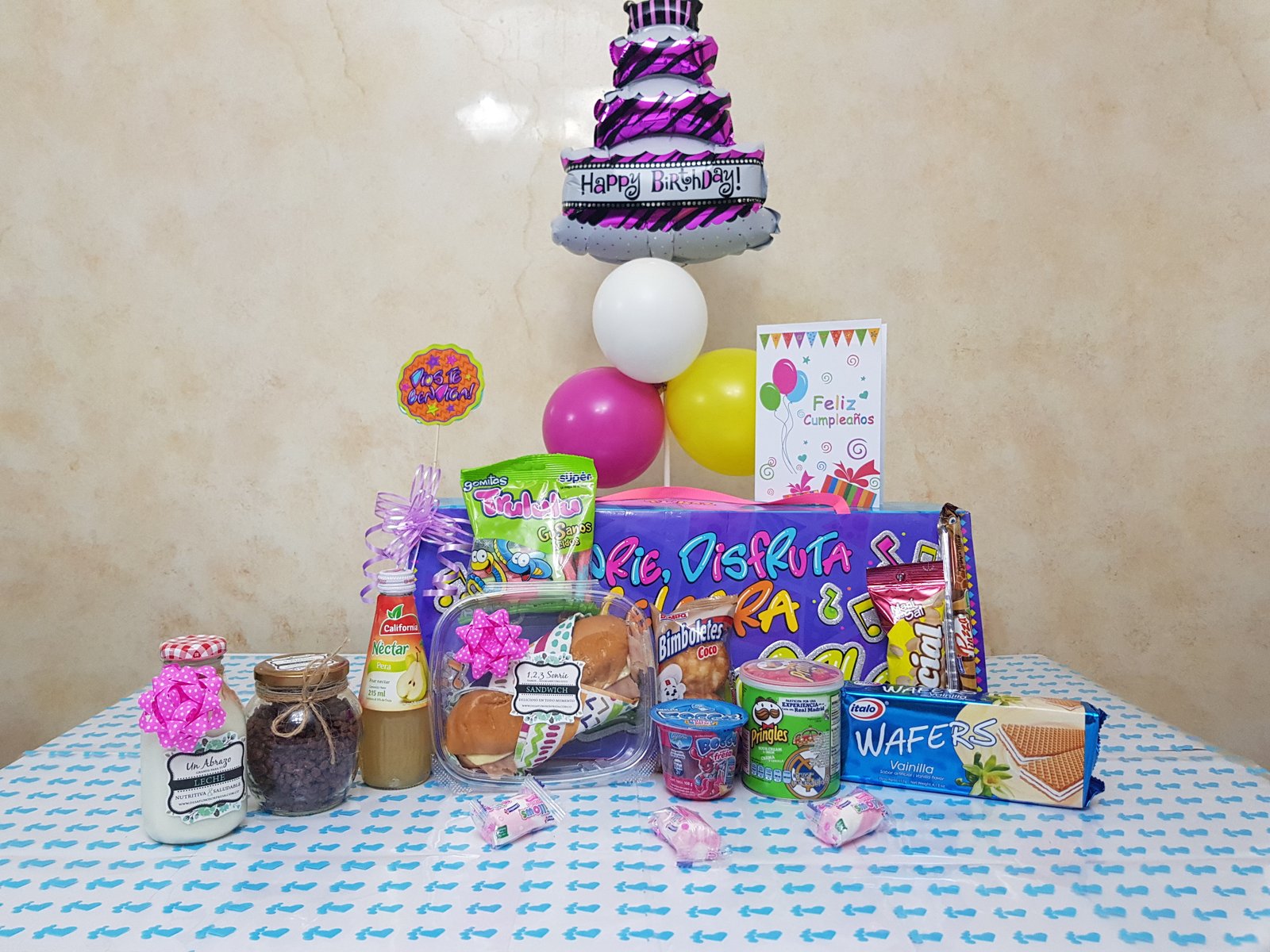 Este desayuno es empacado en una hermosa caja decorada con imagen de feliz cumpleaños.